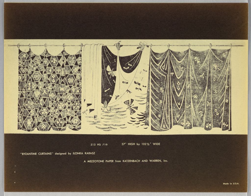This is a Page from a sample book. It was designed by Ilonka Karasz and made by Katzenbach and Warren, Inc.. It is dated 1948 and we acquired it in 1959. Its medium is mezzotone print on paper. It is a part of the Wallcoverings department.