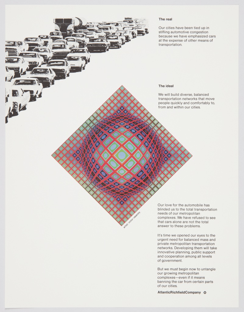 Print, The Ideal vs. The Real Advertisement Proof; Designed by Herbert Bayer (American, b. Austria, active Germany and USA, 1900–1985); Featuring artwork by Victor Vasarely; Client: Atlantic Richfield Company; offset lithograph on glossy white paper; 28.1 × 21.6 cm (11 1/16 × 8 1/2 in.); Museum purchase with funding provided by the Buddy Taub Foundation, Dennis A. Roach and Jill Roach Directors; 2016-54-285