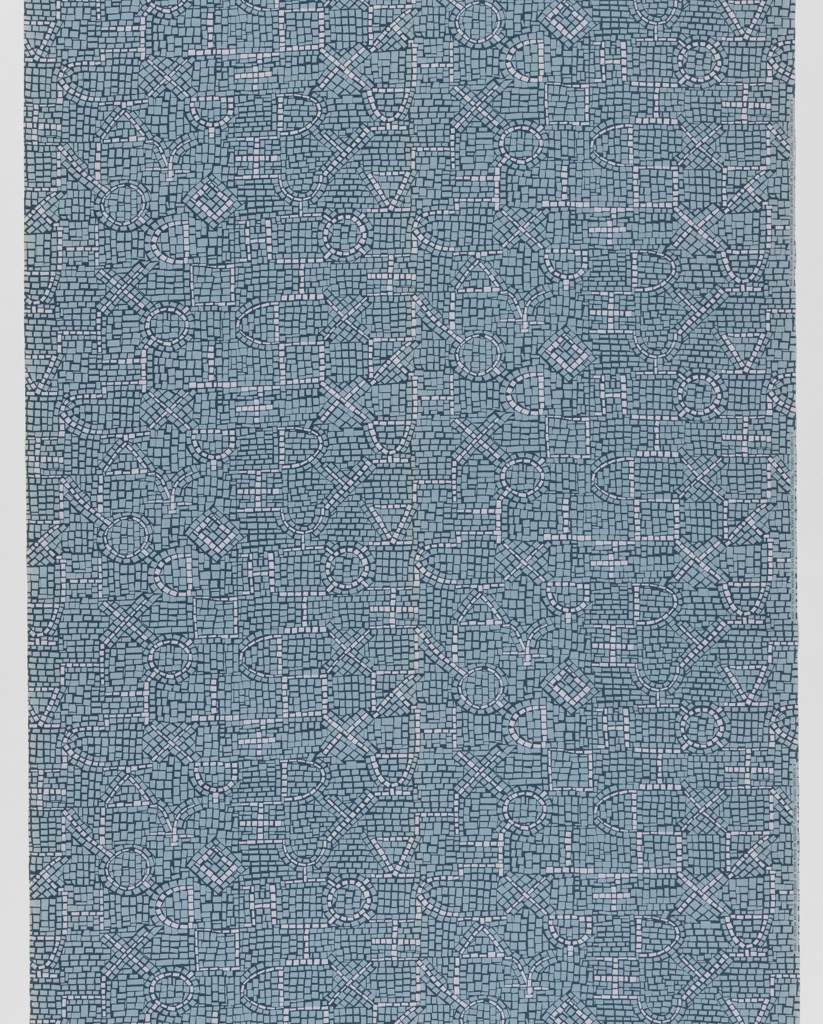 Mosaic, designed to resemble aqua and gray tiles laid into a darker teal ground, was created by Spanish-born artist Ramon Prats. Prats, who left the U.S. shortly after working with Associated American Artists, went on to spearhead the development of modern art in Mexico during the half-century that followed.