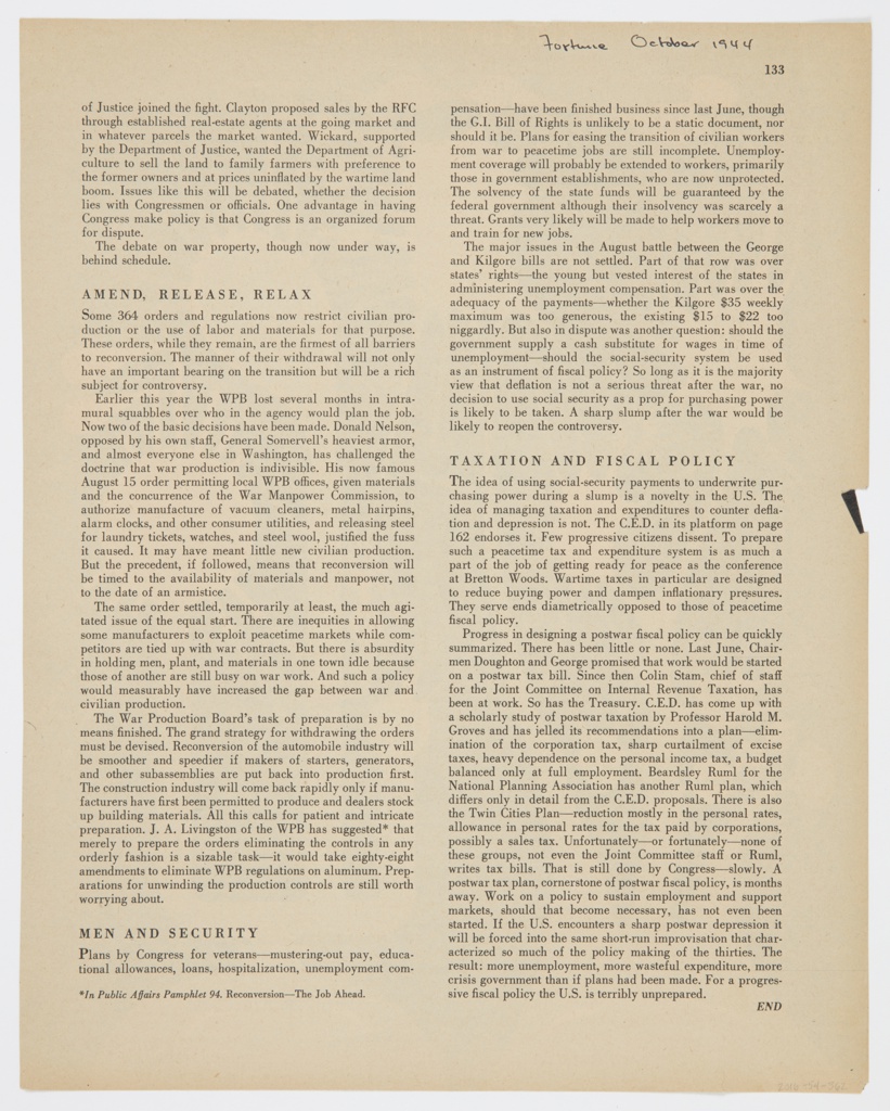 Inscribed in pen and black ink, verso, upper right: Fortune October 1944; Printed in black ink, verso, upper right: 133