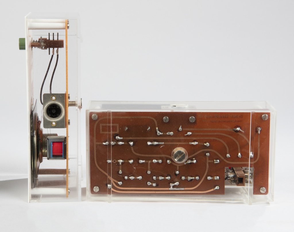 At a toy fair in Nuremberg, Germany in 1966, engineer George Greger introduced The Lectron System of small magnetic blocks that could be arranged to create electrical circuits. In 1967, Braun began producing and distributing this educational set and also released two new assembly kits, a radio receiver and these intercoms, along with it. The top, sides, and back of the intercoms are translucent so that the user can observe the internal circuitry.