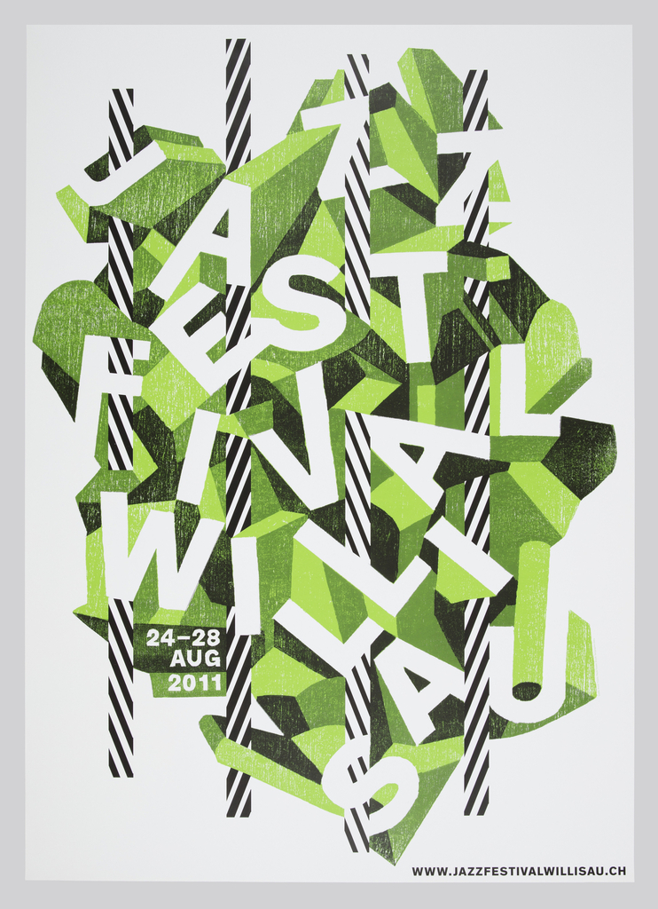 Printed in white text, center: JAZZ / FEST / IVAL / WILLI / SAU; lower left of composition: 24-28 / AUG / 2011; in black, lower right: WWW.JAZZFESTIVALWILLISAU.CH
