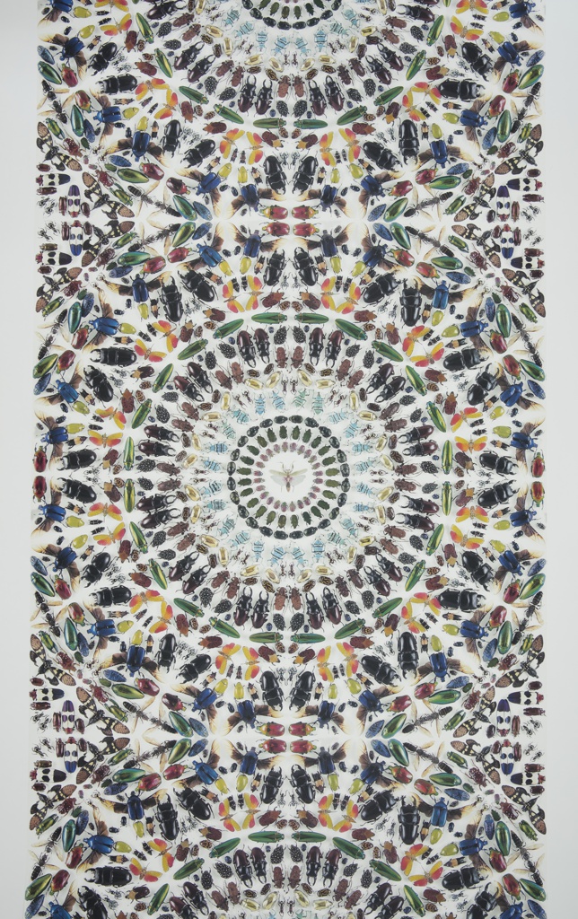 There are three wallpapers with repeating patterns composed of butterflies and one of beetles that are based on his “Kaleidoscope” paintings which be began in 2001. This includes one design that was produced in a limited edition of 500. The butterfly is one of Hirst’s most iconic and familiar motifs, and the Kaleidoscope paintings reference the spiritual symbolism of the butterfly, used by the Greeks to depict Psyche, the soul, and in Christian imagery to signify the resurrection. Unlike his earlier butterfly works that contained the complete insect, in the Kaleidoscope paintings Hirst used only the iridescent wings, which he felt divorced the butterfly from the real thing.