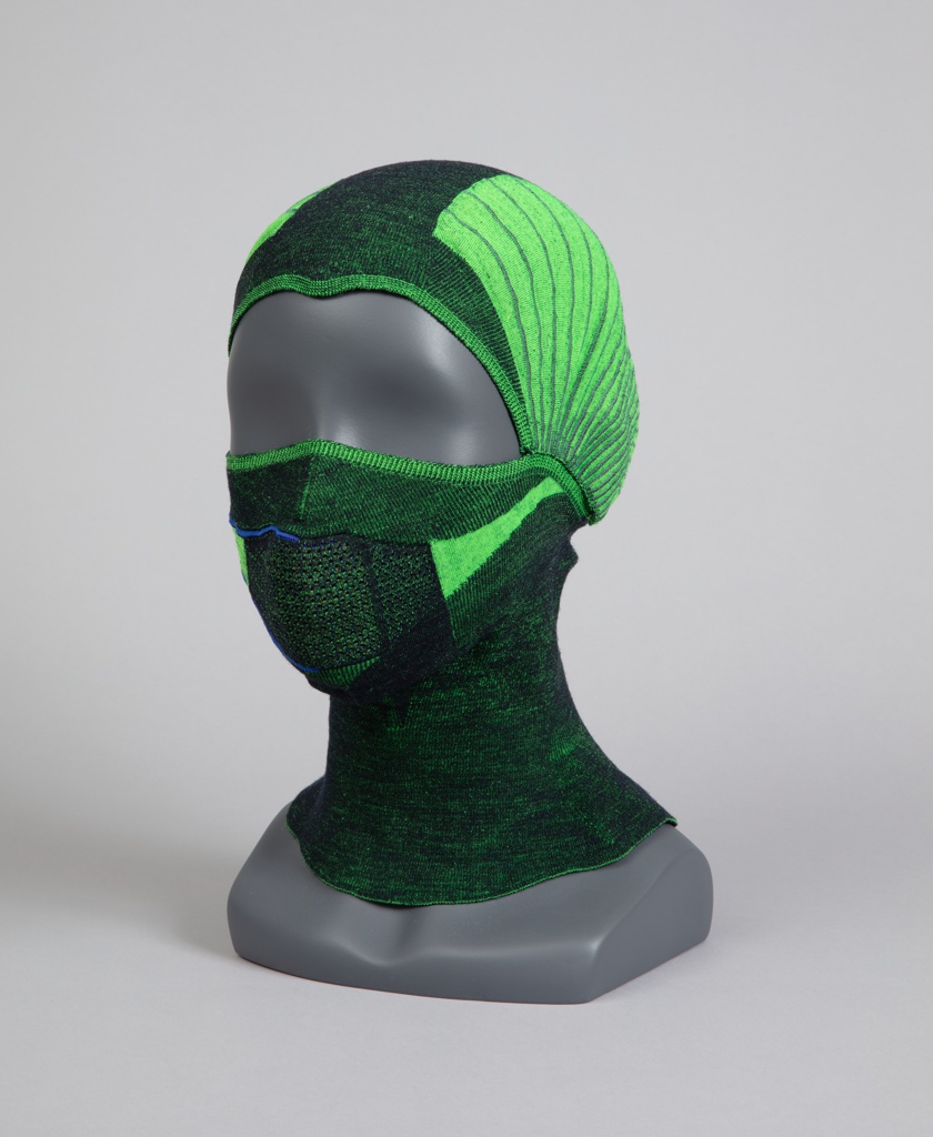 This is a Balaclava. It was designed by Jörg Hartmann and manufactured by H. Stoll AG & Co. KG and design team member: Karen Klabunde, Petra Meyer and Francesco Collura. It is dated 2016 and we acquired it in 2017. Its medium is virgin wool, lycra, polyamide, polyester reflective yarns, copper and its technique is flat-bed knitted. It is a part of the Textiles department.
