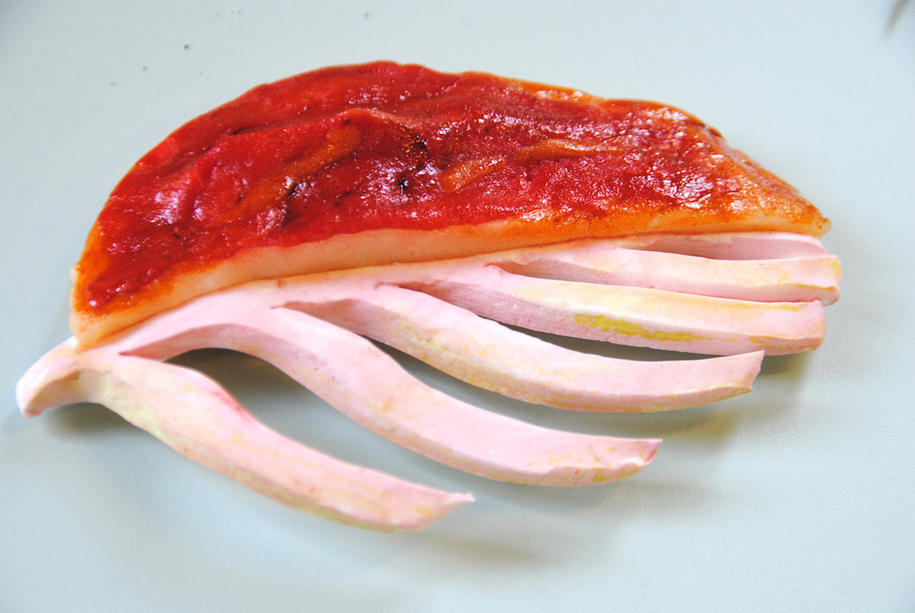 Plant Bones are palm-sized objects with boney, ribbed structures shaped like leaves. This speculative project by Marije Vogelzang proposes a future of plant-based protein grown on the boney scaffolds of a mutant plant species. Imagine spare ribs, without the pig. Rather than using traditional utensils, could we one day grow food on bone-like structures to finger and nibble, our tongues wrestling the food from between the ribs?