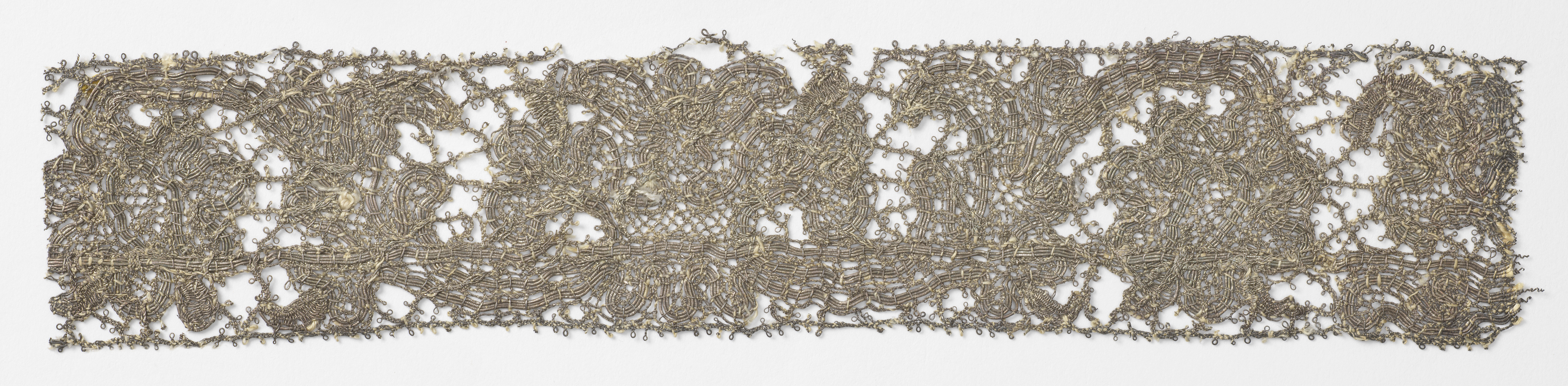 This is a Fragment. It is dated 17th century. Its medium is metallic-wrapped linen thread and its technique is bobbin lace, metallic. It is a part of the Textiles department.