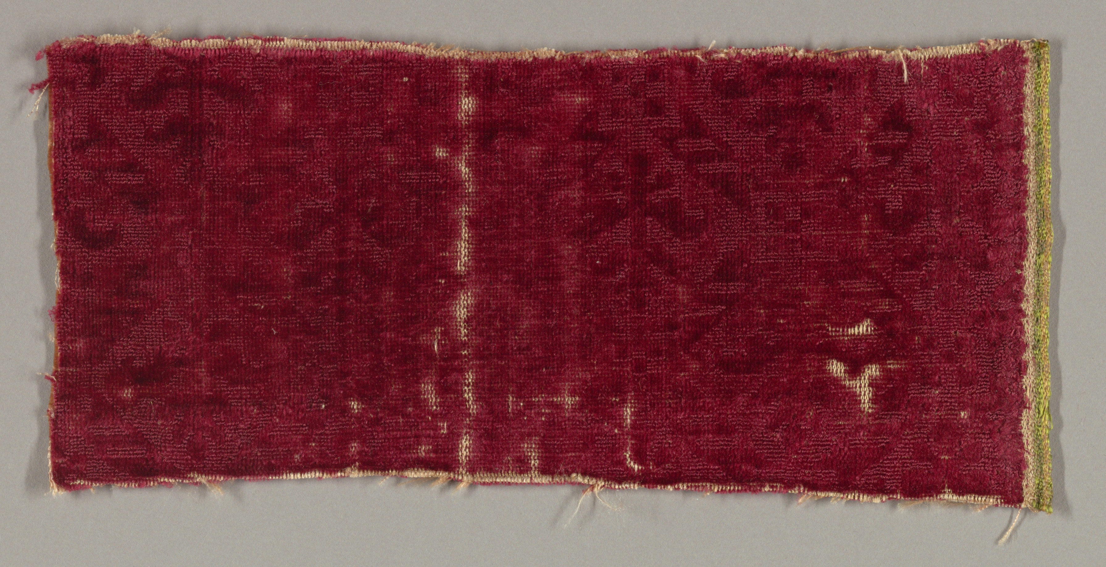 This is a Fragment. It is dated 17th century. Its medium is silk and its technique is supplementary warp forming cut and uncut pile in a plain weave foundation (velvet). It is a part of the Textiles department.