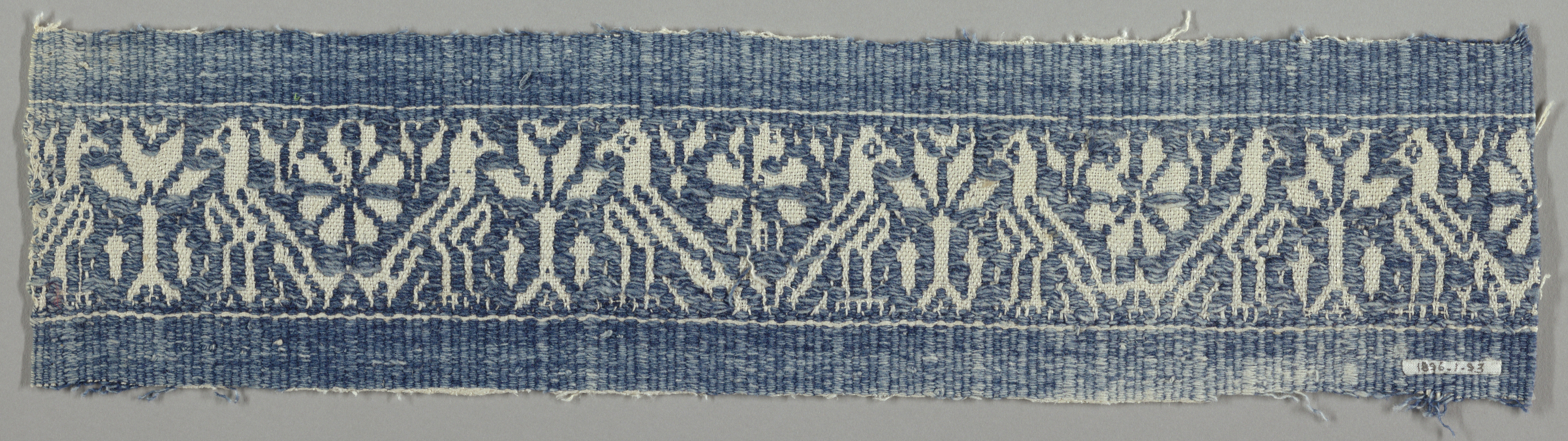 This is a Towel fragment. It is dated 17th century. Its medium is linen, cotton and its technique is plain weave with supplementary weft. It is a part of the Textiles department.
