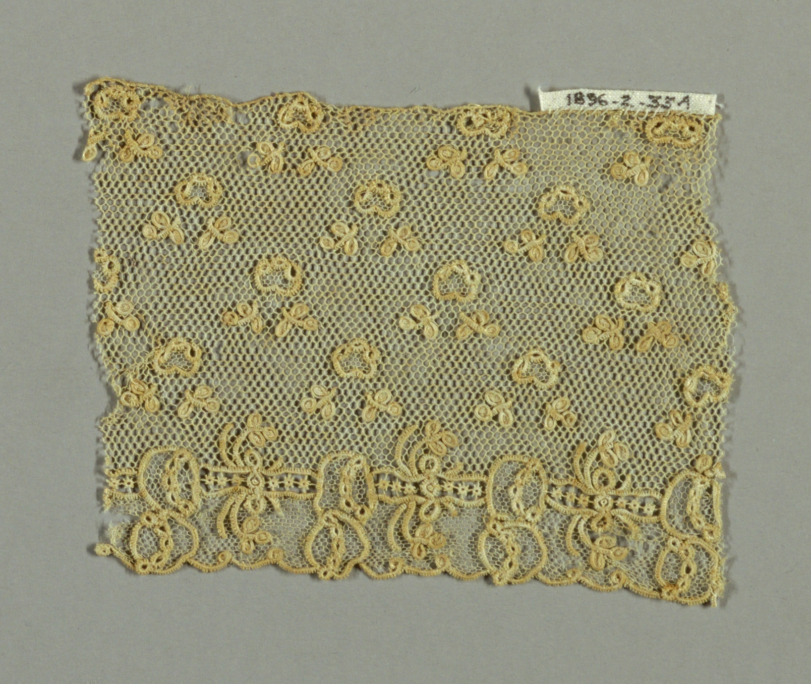 This is a Fragment. It is dated late 18th century. Its medium is linen and its technique is needle lace. It is a part of the Textiles department.