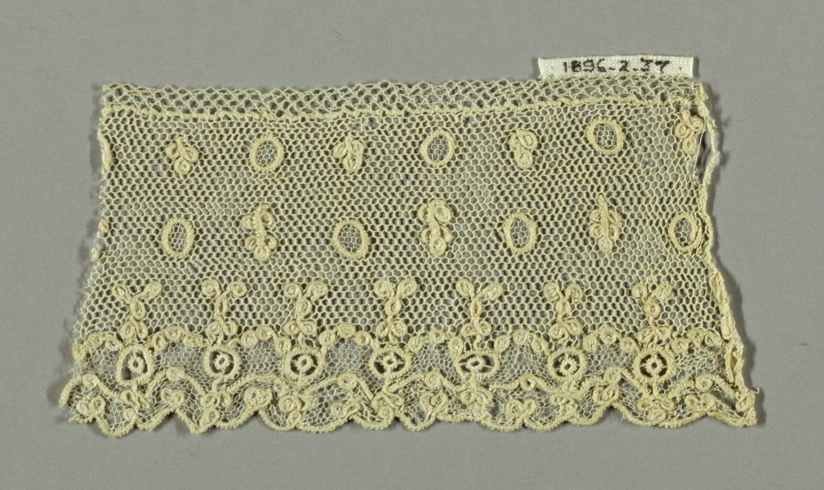 This is a Fragment. It is dated late 18th century. Its medium is linen and its technique is needle lace. It is a part of the Textiles department.