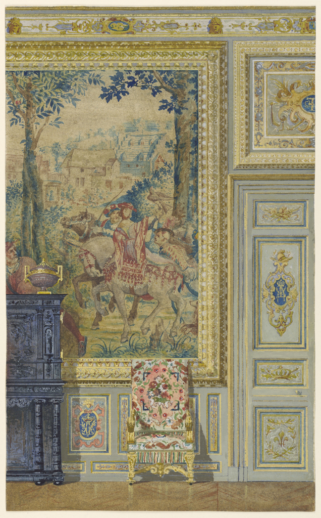 Drawing, Section of a wall showing portion of Flemish tapestry, Tapestry room, Palace of Fontainebleau, France; Frederick Marschall; USA; brush and watercolor, tempera on heavy paper; 38 x 23.3 cm (14 15/16 x 9 3/16 in.); Gift of Mrs. Lloyd S. Bryce; 1896-29-2