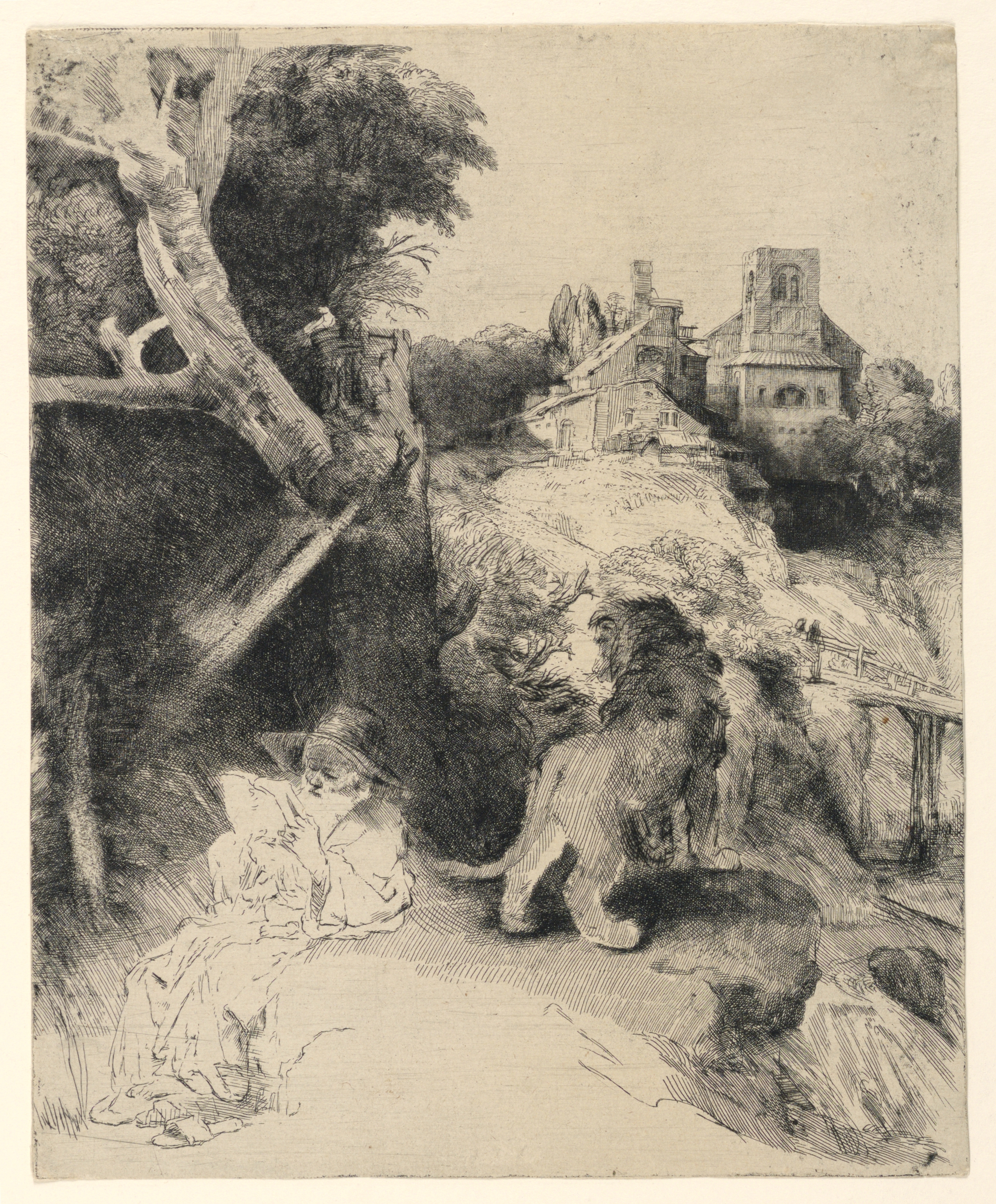 Print, Saint Jerome Reading in an Italian Landscape; Rembrandt Harmensz van Rijn (Dutch, 1606–1669); Netherlands; etching on off-white laid paper; 26 × 2.1 cm (10 1/4 × 13/16 in.); Bequest of George Campbell Cooper; 1896-3-163