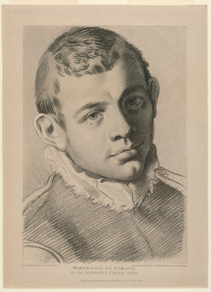 This is a Print. It was print maker: Francesco Bartolozzi and after Annibale Carracci and published by John Chamberlaine and sitter: Annibale Carracci. It is dated 1796. Its medium is engraving in the crayon manner on pale pink paper. It is a part of the Drawings, Prints, and Graphic Design department.