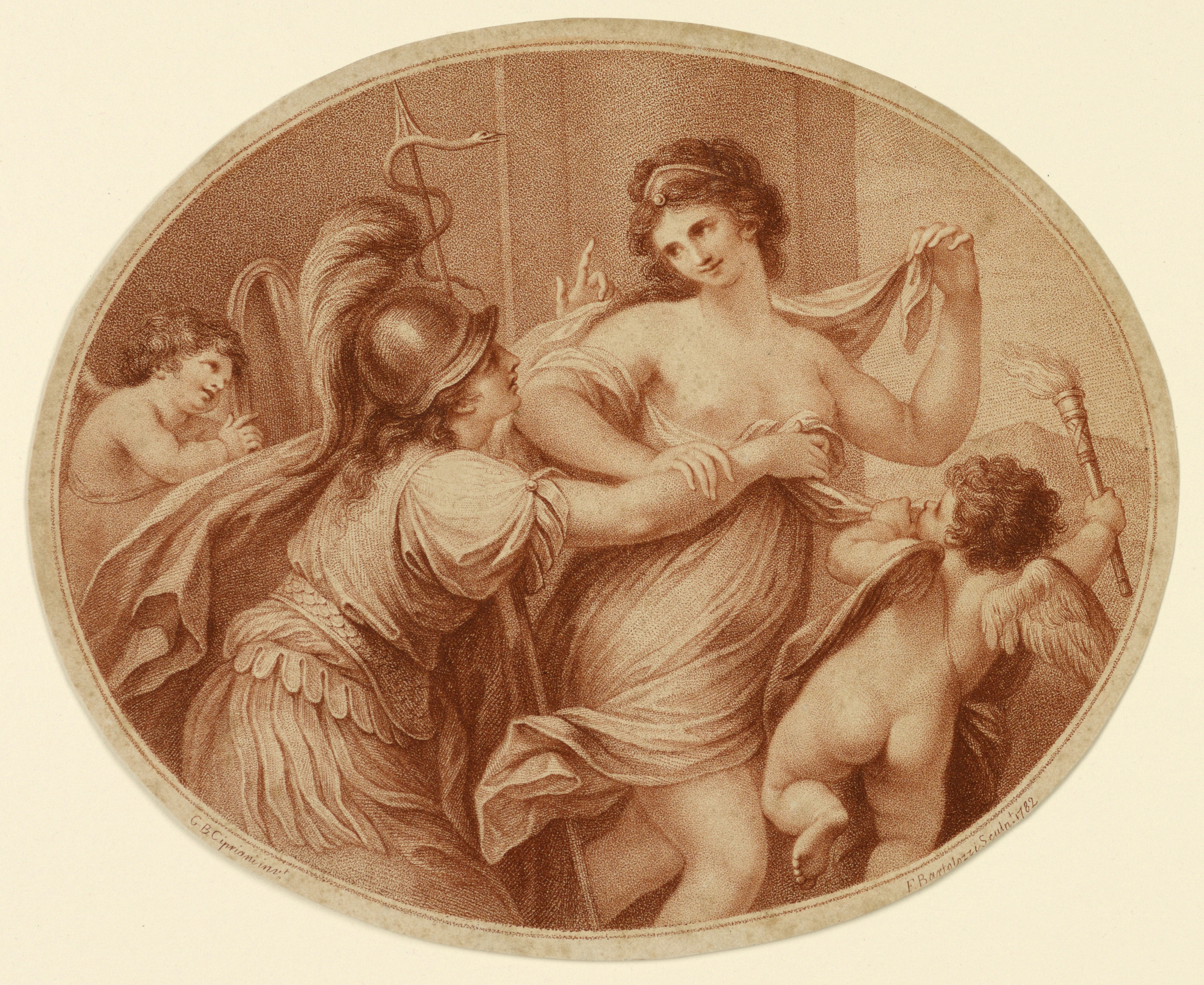 Below framing line, lower left: G. B. Cipriani invt.; lower right: F. Bartolozzi Sculpt. 1782.