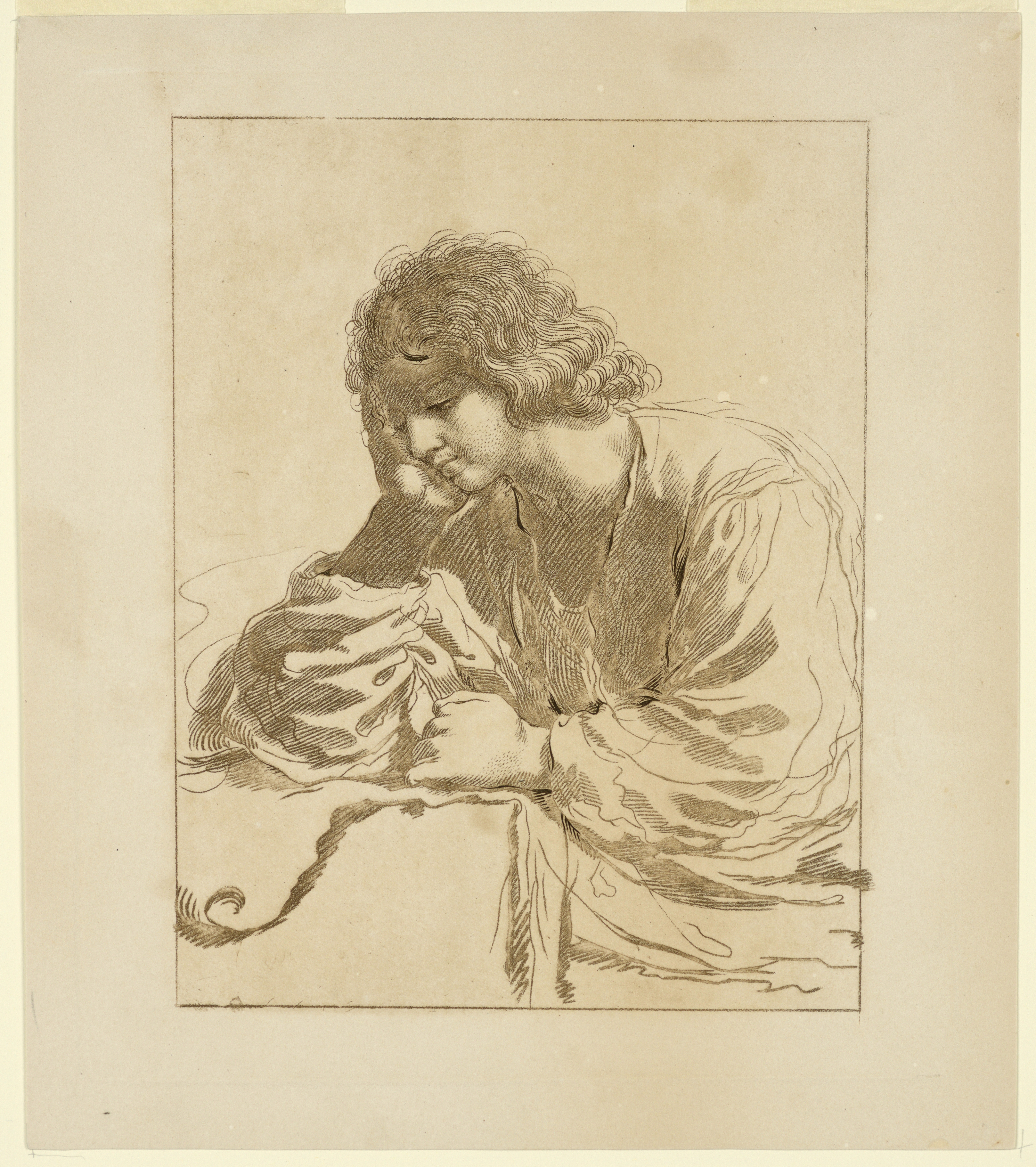 Print, A Young Man in Meditation; Print Maker: Giovanni Vitalba (Italian, 1783 - 1792); After Giovanni Francesco Barbieri (called Guercino) (Italian, 1591 – 1666); Italy; engraving in brown ink on white paper; 1896-3-353