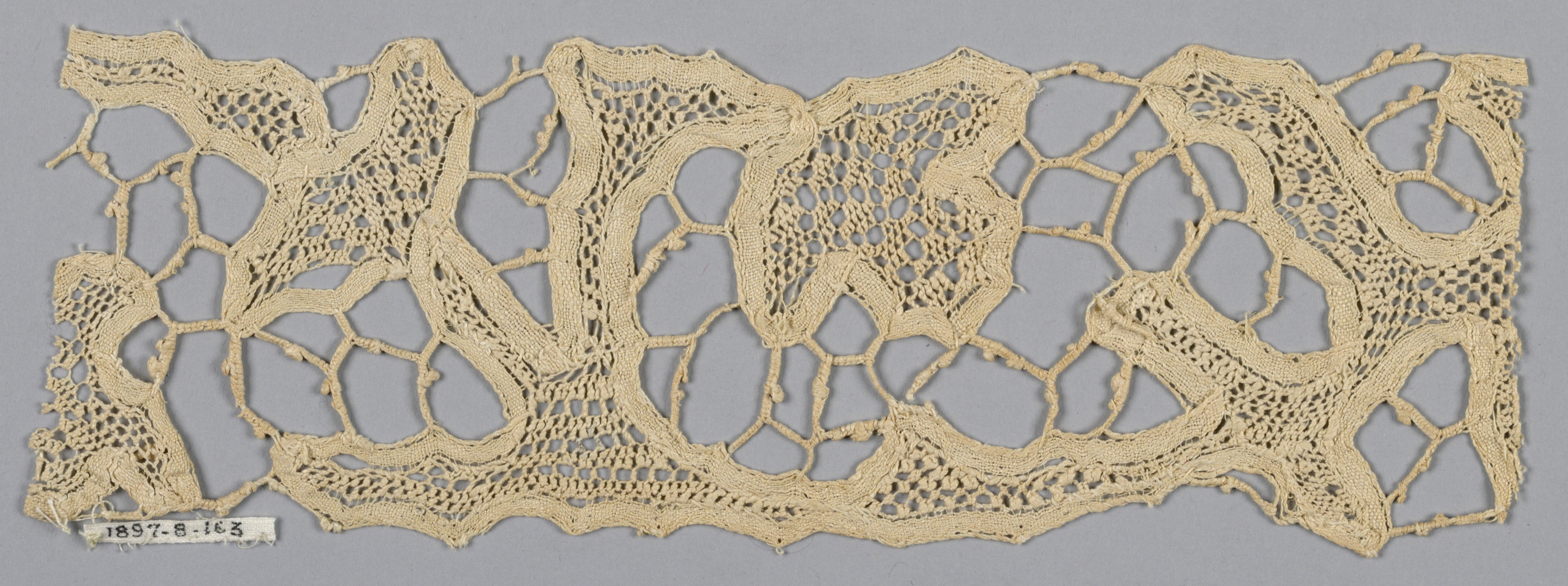 This is a Fragment. It is dated 17th century. Its medium is linen and its technique is lace of early premade tape with needle work fillings. It is a part of the Textiles department.