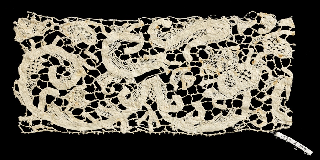 This is a Fragment. Its medium is linen and its technique is lace of premade tape with needlework fillings and needle connections. It is a part of the Textiles department.