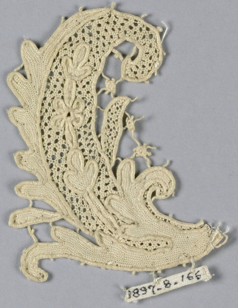 This is a Fragment. It is dated 17th century. Its medium is linen and its technique is needle lace. It is a part of the Textiles department.
