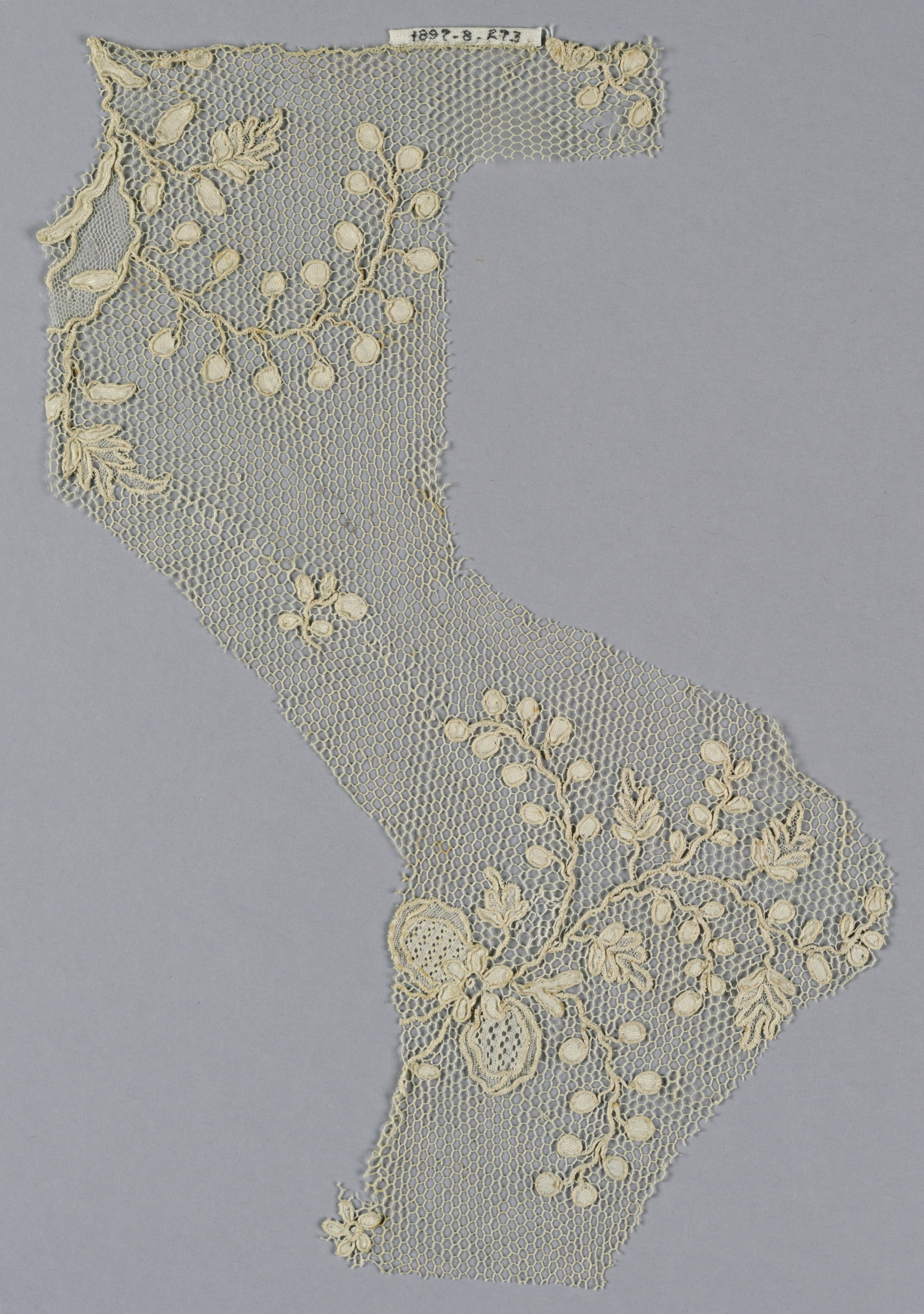 This is a Fragment. It is dated late 18th century. Its medium is linen and its technique is needle lace. It is a part of the Textiles department.