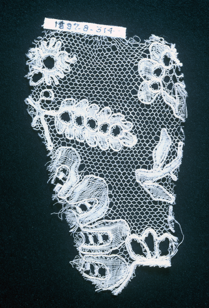 This is a Fragment. It is dated 19th century. Its medium is linen and its technique is bobbin lace made in lille style with heavy outlining thread. It is a part of the Textiles department.