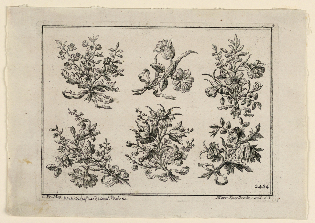 Print, Flowers; Published by Martin Engelbrecht (German, 1684–1756); Germany; engraving on paper; Plate: 14.9 × 20.1 cm (5 7/8 × 7 15/16 in.) Paper: 17.5 × 24.9 cm (6 7/8 × 9 13/16 in.); Gift of Bridget Mahon; 1898-28-4