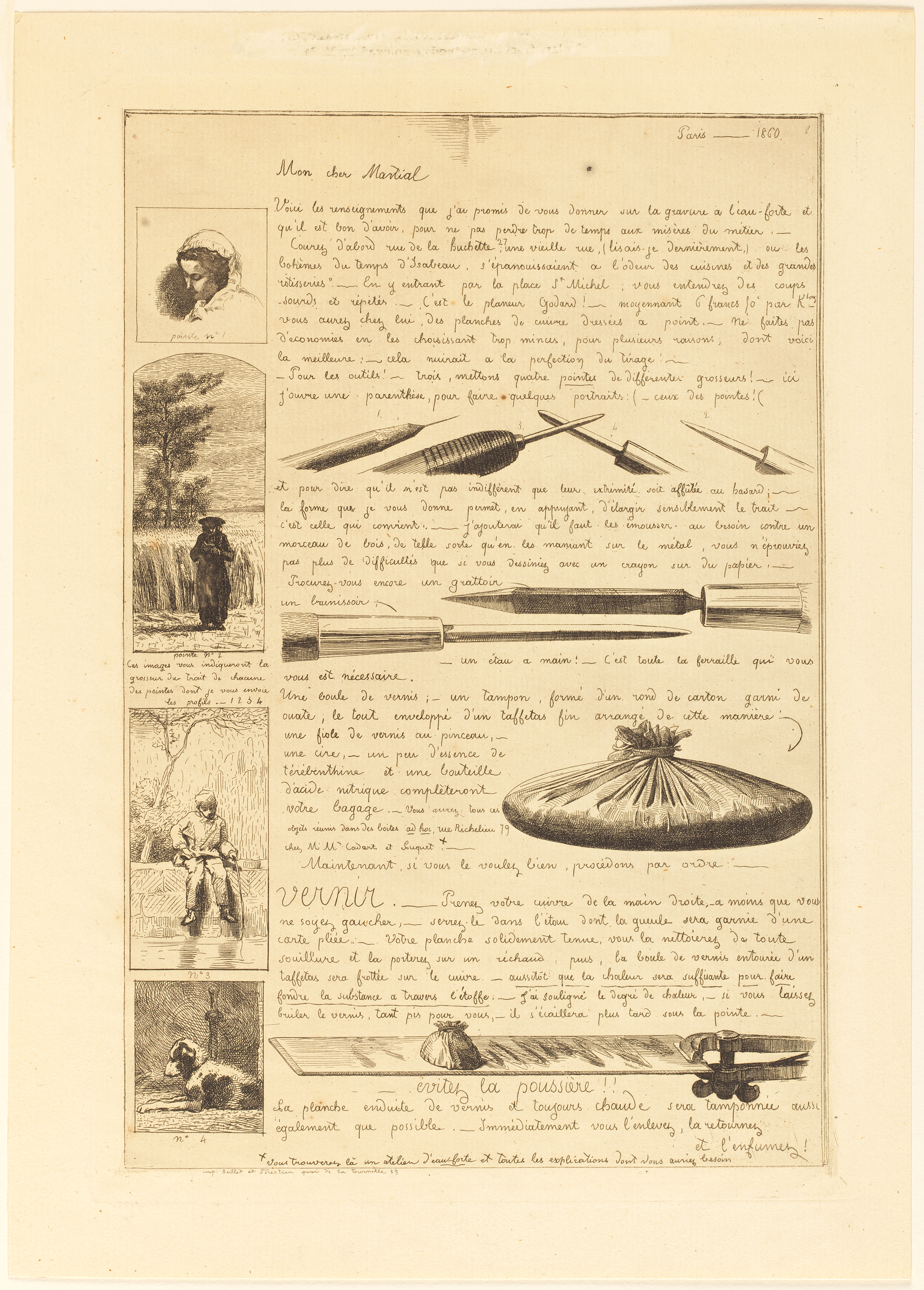 Print, Lettre sur les Eléments de la gravure á l'Eauforte (Letter on the elements of etching), Page 1; Print Maker: Adolphe-Martial Potémont (French, 1828 - 1883); France; etching on paper; 44.3 × 32.5 cm (17 7/16 × 12 13/16 in.); Gift of Samuel P. Avery; 1898-6-66-1