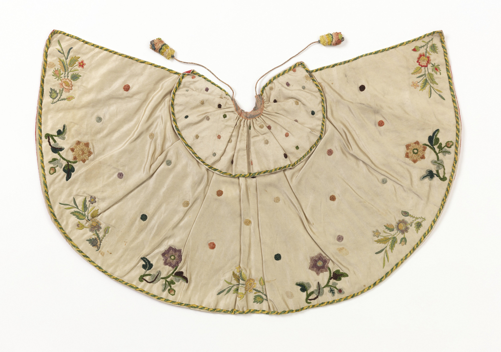 This is a Cape for an ecclesiastical figurine. It is dated 1750–99. Its medium is silk, metallic yarns, sequins and its technique is embroidered on satin; lined with taffeta. It is a part of the Textiles department.