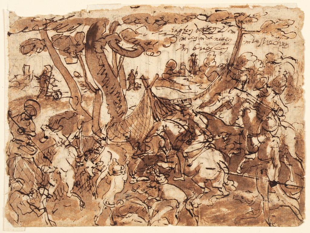 Drawing, Deer Hunt with Nets; Jan van der Straet, called Stradanus (Flemish, 1523–1605); Subject: Saint Giovanni Gualberto (Italian, 985 - 1073); Netherlands; pen and ink, brush and brown wash on paper; H x W: 10.9 × 14.8 cm (4 5/16 × 5 13/16 in.); Museum purchase through gift of various donors; 1901-39-128