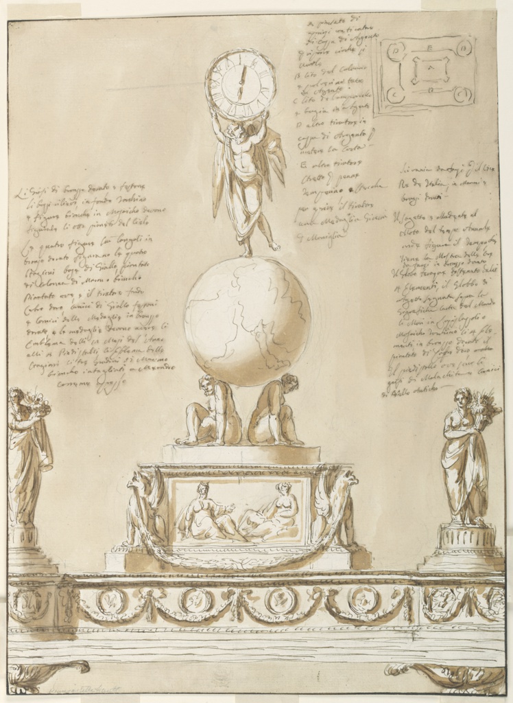 Inscription at left: Li grifi di brosso dorato e festone/ li bassi rilievi in fondo turchino/ e figure bianche in Mosaicho devono/ figurarle li otto pianeti del Cielo/ Le quatro/ stagioni base/ di Gialli piantati/ di colonna di marmo biancho/ Piantato ove e il tiratore fondo/ Sabro dove cornice/ di gialli festoni/ e cornici delle Medaglie in bronso/ dorato e Dettaglio della cornice sopra il/ Fregio ossia della cimara dell'/ architrave andante. Il listello/ introdotto fra il guscio e l'ovolo/ e necessario per dividere gl'intagli/ dei due membri acio non si confondono. The scales: "Scale di Palmi due per il Detaglio" and "Scala di Palmi Romani Architectonici"