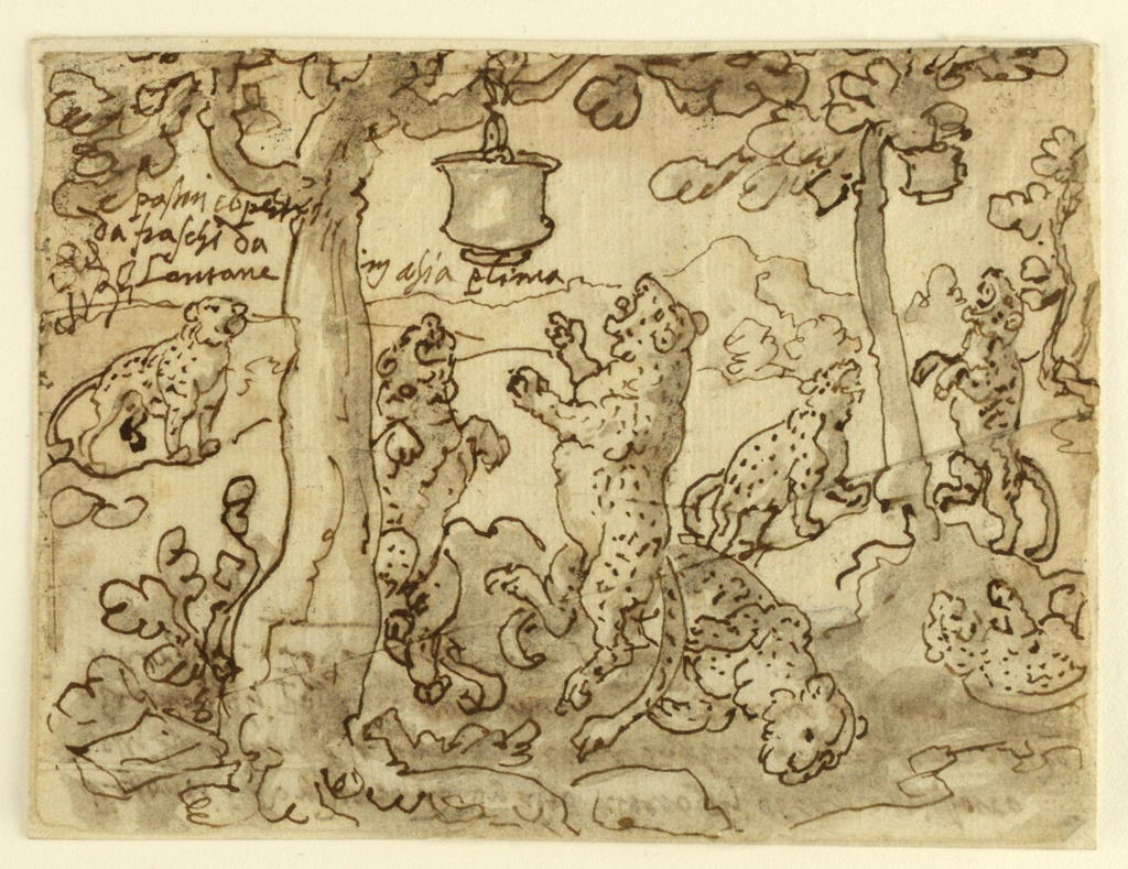 Recto, inscribed in pen and ink: "pastori coperti/da fraschi da/lontane /in asia plinea" Verso, inscribed in pen and ink: "Legonsi in un vaso as un altro albero gli escrementi sterco/delli huomini a le panthere come tighere ne sono tanto arcide che non gli potendo arrivare o amazzano col saltare per/avergli, Lbo. 8 cap. 27. Plinio."
