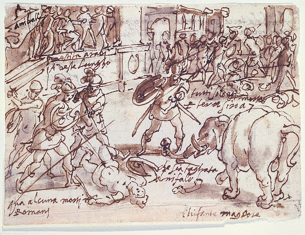 Recto, inscribed in pen and ink: "aniballe / vestita arabi / A veste lungho" / "qua alcuna morti / Romani" / "tutti soldati morti / p[er] terra sino a 7" / "che sia tagliata / el nifalo / elifante magiore" Verso, inscribed in pen and ink: "Anibale fecce combatere tra loro parecchi Romani prigioni 7. / campovive uno e lo fecce gettar vive a un liofante prometten / doli se l' ammazzava lassarlo andar libro il Romano / amanazzo li elefante a solo a solo ma fu fatto morire da chavalleri da Anibale L[ibro] 8 cap - 7 - plinie"