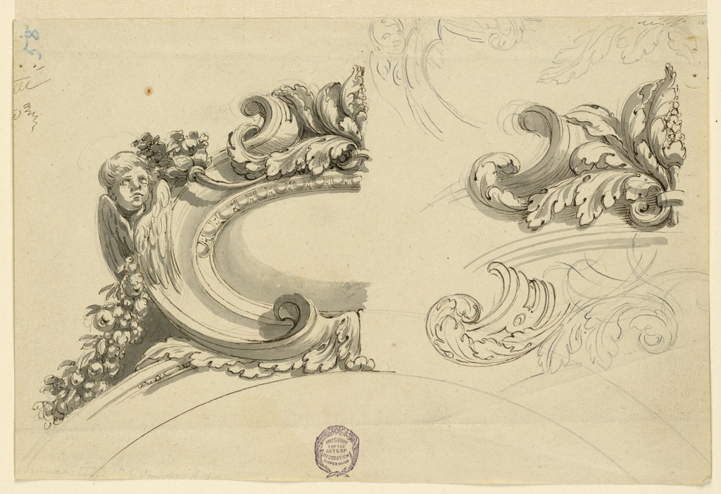 Drawing, Project for Decorative Escutcheon; Manufactured by Flaminio Innocenzi Minozzi (Italian, 1735 – 1817); Italy; pen and ink, brush and grey water color on paper; 24.6 x 16.5 cm (9 11/16 x 6 1/2 in.); Museum purchase through gift of various donors; 1901-39-1770
