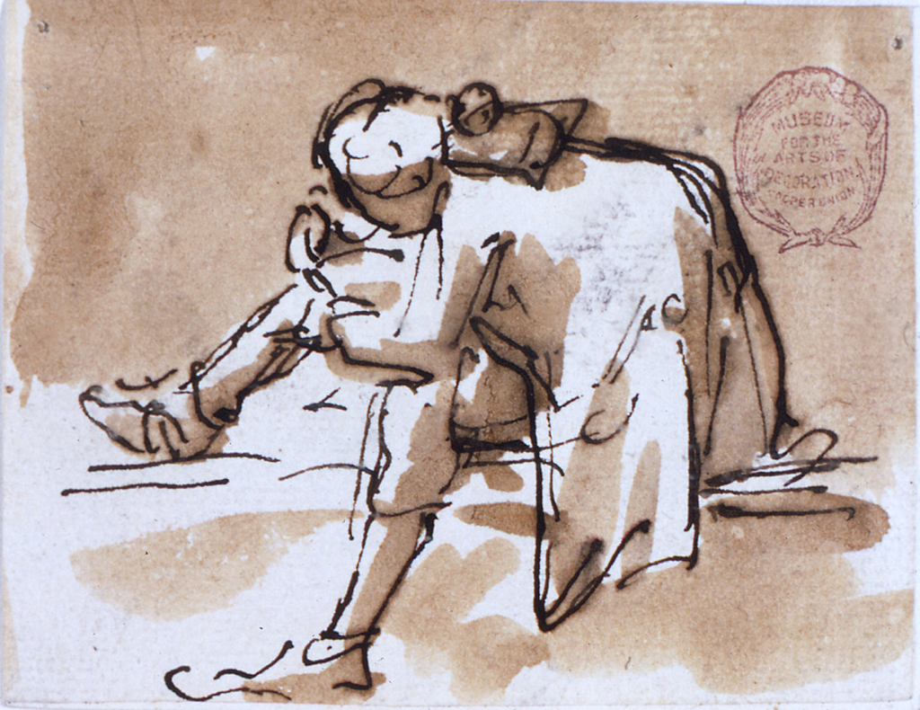 Drawing, Hunchback sitting on a step; Architect: Giuseppe Barberi (Italian, 1746–1809); Manufactured by Giuseppe Valadier (Italian, 1762–1839); Italy; pen and brown ink, brush and brown wash, on paper; 7.1 x 9.1 cm (2 13/16 x 3 9/16 in.); Museum purchase through gift of various donors; 1901-39-2056