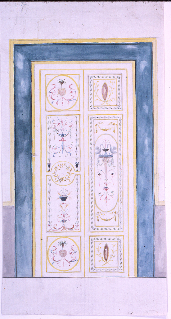 Drawing, Design for a Painted Door; France & Italy; graphite, pen and ink, brush and watercolor, sepia on paper; H x W: 31.5 × 16.6 cm (12 3/8 × 6 9/16 in.); Museum purchase through gift of various donors; 1901-39-2128