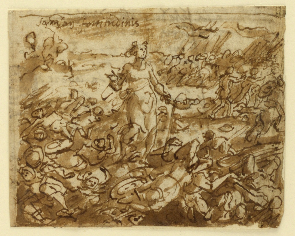 Drawing, The Spirit of Strength; Jan van der Straet, called Stradanus (Flemish, 1523–1605); Engraved by Adriaen Collaert (Flemish, ca. 1560 – 1618); Netherlands; pen and brown ink, brush and wash on paper; 8.2 × 10.3 cm (3 1/4 × 4 1/16 in.); Museum purchase through gift of various donors; 1901-39-2659