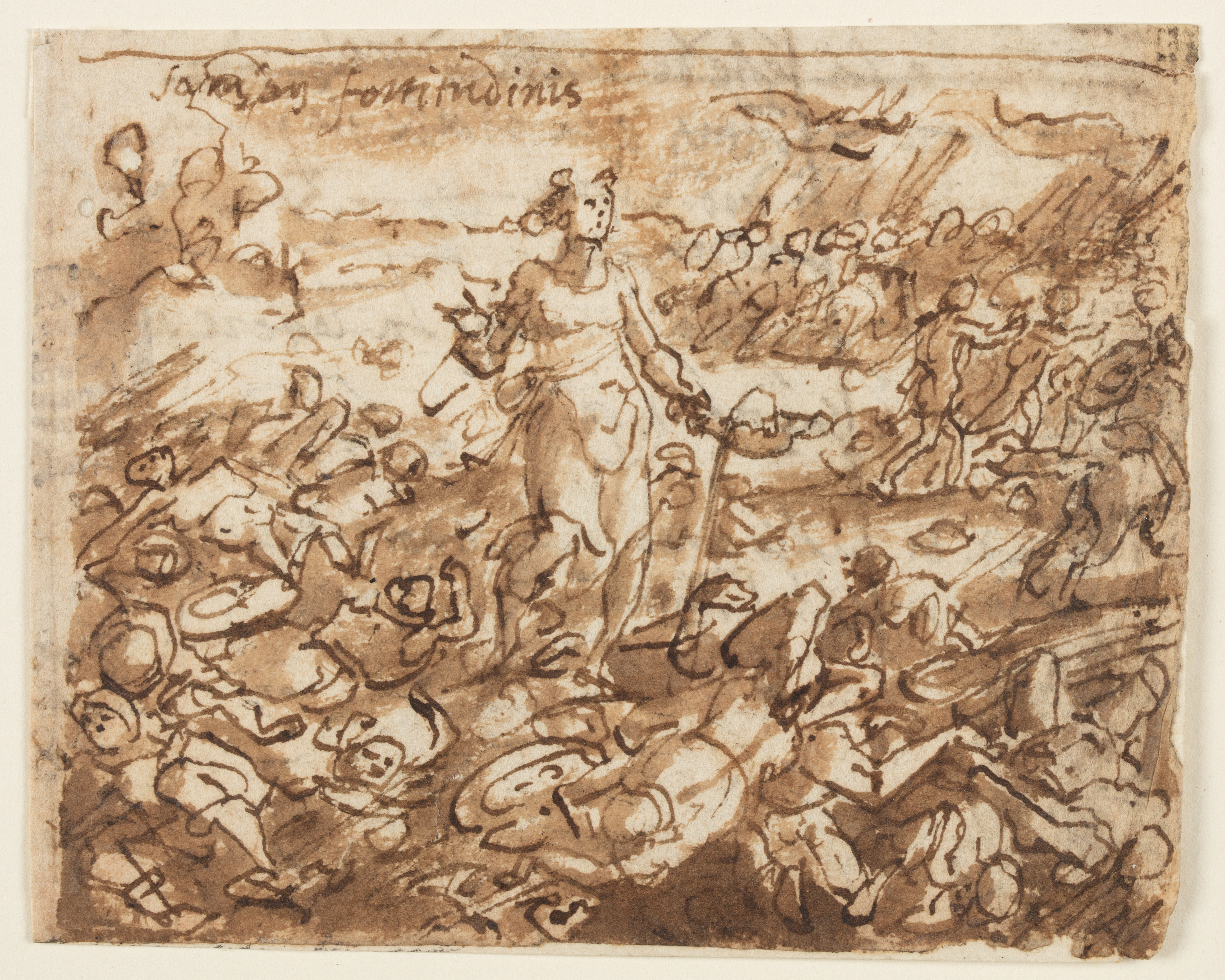 Drawing, The Spirit of Strength; Jan van der Straet, called Stradanus (Flemish, 1523–1605); Engraved by Adriaen Collaert (Flemish, ca. 1560 – 1618); Netherlands; pen and brown ink, brush and wash on paper; 8.2 × 10.3 cm (3 1/4 × 4 1/16 in.); Museum purchase through gift of various donors; 1901-39-2659