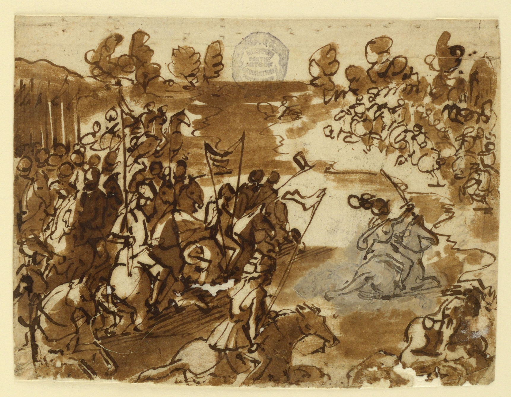 Drawing, Giovanni de' Medici leading his troops across the river Adda, driving back the Spanish forces; Jan van der Straet, called Stradanus (Flemish, 1523–1605); Association: Luigi Alamanni (Italian, 1558–1603); Subject: Medici Family; Netherlands; pen and brown ink, brush and wash, corrected with white, over black chalk on laid paper; 10.8 × 14 cm (4 1/4 × 5 1/2 in.); Museum purchase through gift of various donors; 1901-39-2675