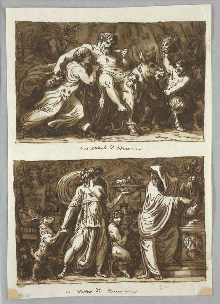 Below upper image, bottom center in pen and brown ink: Trionfo di Sileno Below lower image, bottom center in pen and brown ink: Feste -corrected over Festa "di Bacco"
