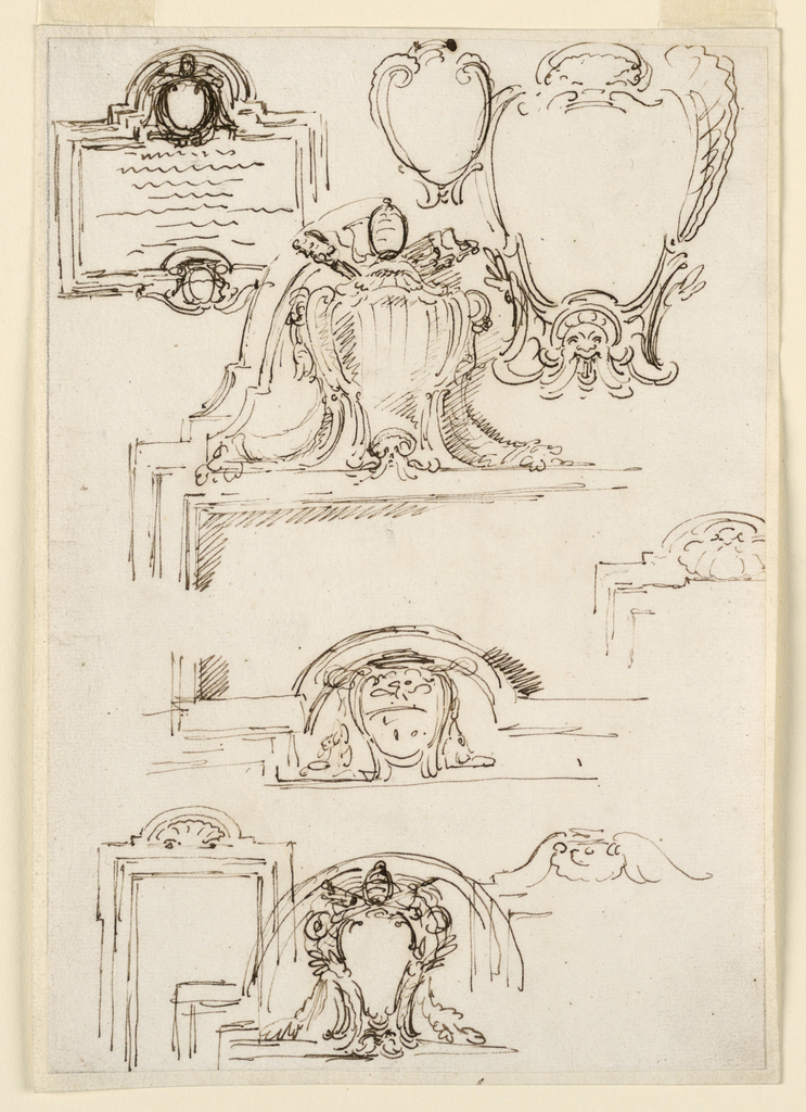 Drawing, Nine Sketches for Tablet Frames; Carlo Marchionni (Italian, 1702–1786); Italy; pen and sepia on laid paper; 26.9 x 18.2 cm (10 9/16 x 7 3/16 in.); Museum purchase through gift of various donors; 1901-39-644