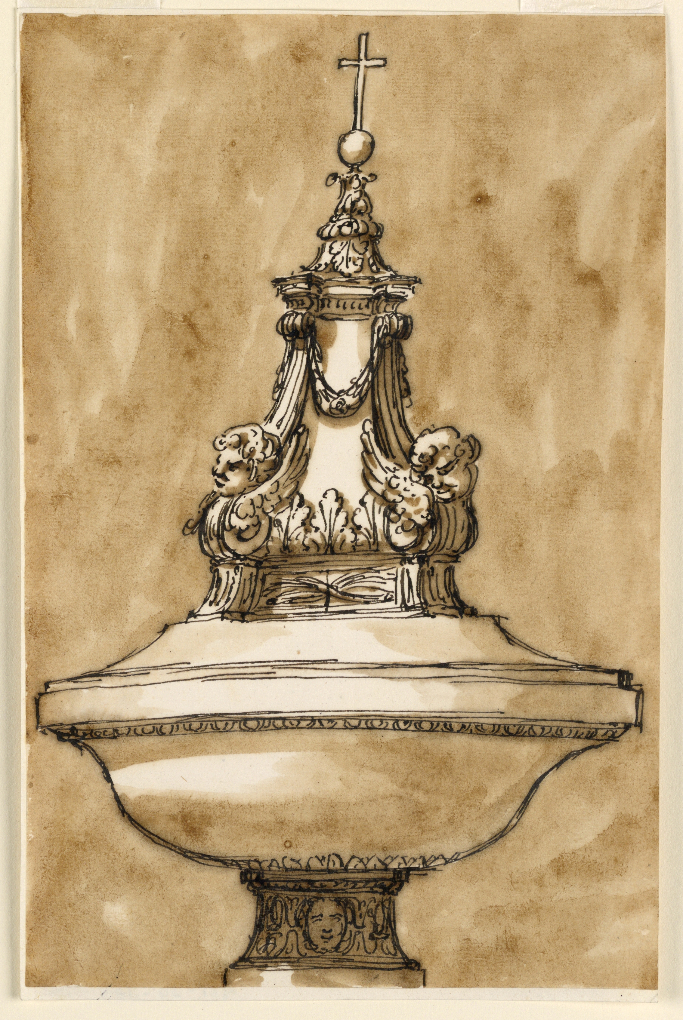 Drawing, Baptismal Font; Architect: Giuseppe Barberi (Italian, 1746–1809); Italy; pen and brown ink, brush and brown wash, on off-white laid paper, lined; 27.3 x 17.7 cm (10 3/4 x 6 15/16 in.); Museum purchase through gift of various donors; 1901-39-729