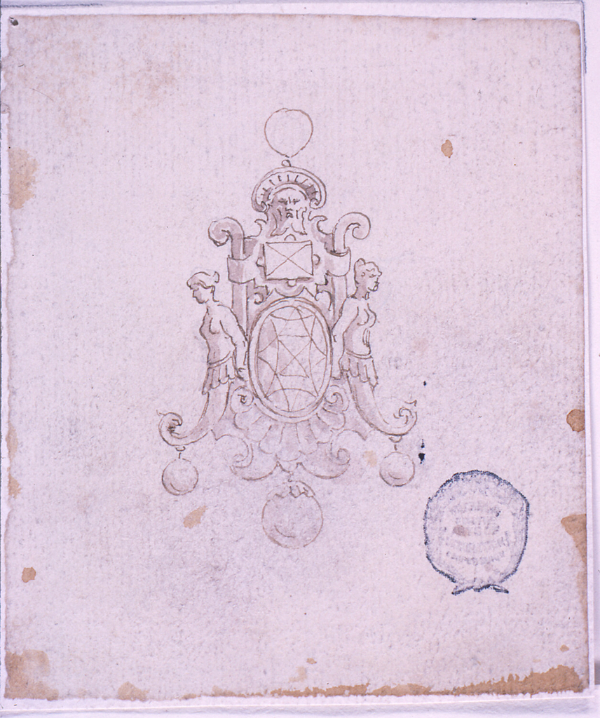 Drawing, Design for Pendant with Half Figures; Italy; pen and ink, brush and watercolor, sepia on paper; H x W: 10.6 × 9.1 cm (4 3/16 × 3 9/16 in.); Museum purchase through gift of various donors; 1901-39-777