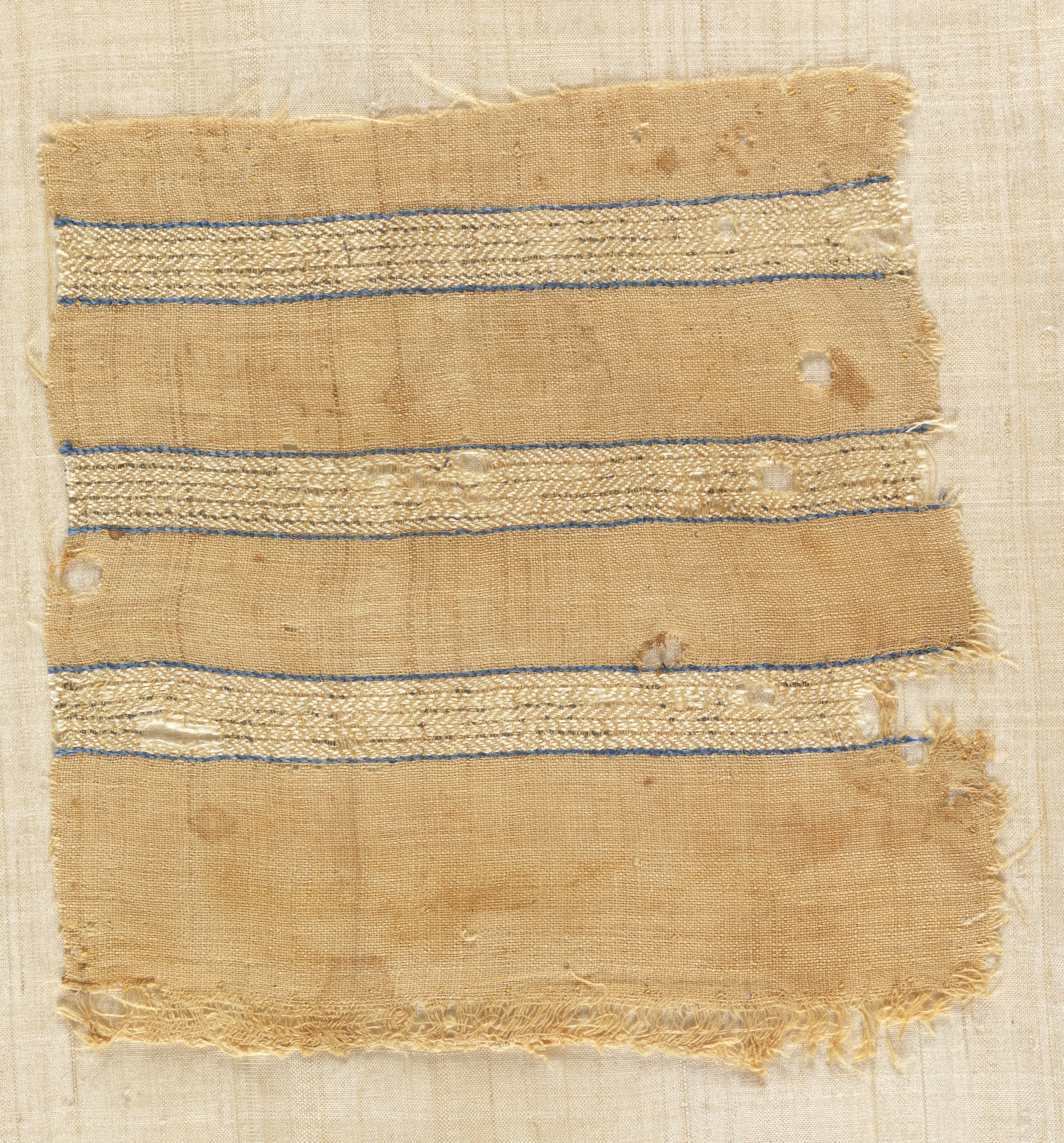 This is a Fragment. It is dated 10th–12th century and we acquired it in 1902. Its medium is linen, silk, metal and its technique is plain weave and 2/2 twill. It is a part of the Textiles department.