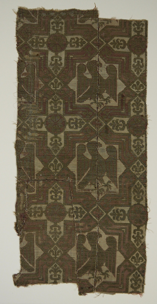 Fragment (Spain); silk, metal wrapped around linen core; Warp x Weft (A): 41 x 19 cm (16 1/8 x 7 1/2 in.) Warp x Weft (B): 7.6 x 34.3 cm (3 in. x 13 1/2 in.); Gift of John Pierpont Morgan; 1902-1-253-a,b