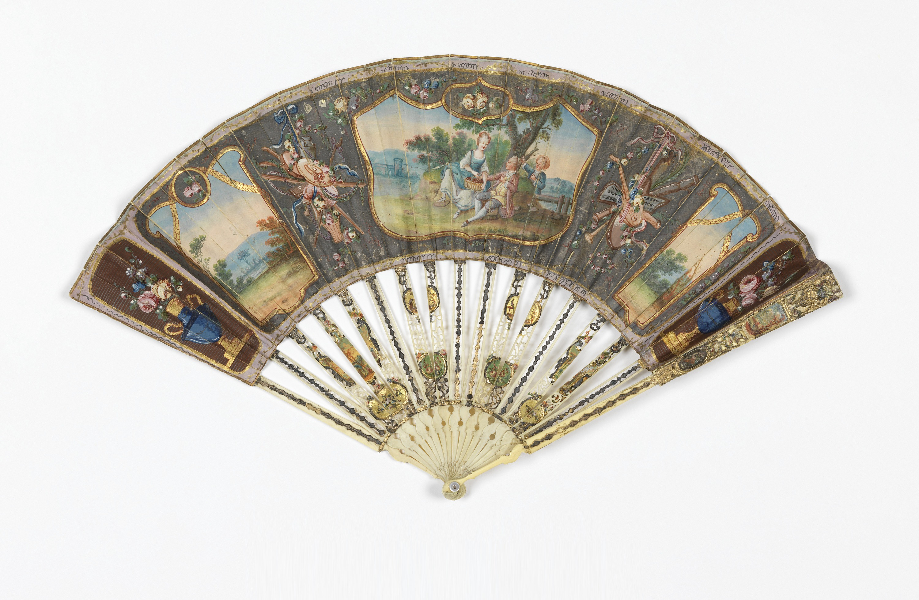 This is a Pleated fan and case. It is dated ca. 1780 and we acquired it in 1906. Its medium is gilded and gouache-painted vellum leaf; carved à jour, silvered, gilded, and painted ivory sticks. It is a part of the Textiles department.