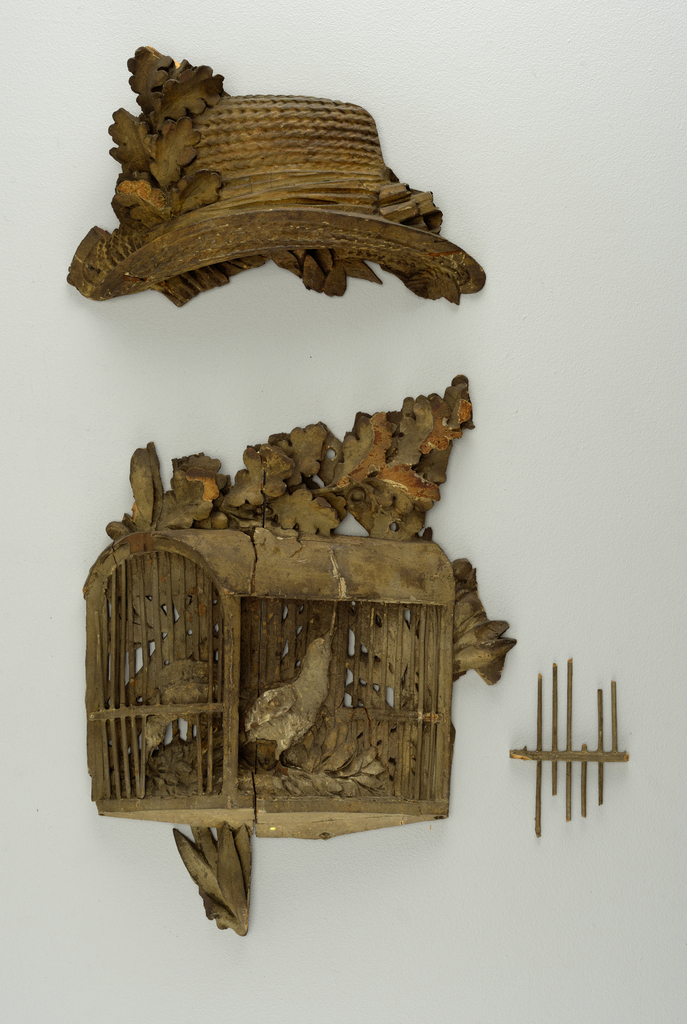 Birdcage; wood, carved and painted; H x W x D (a): 25 x 17 x 4 cm (9 13/16 x 6 11/16 x 1 9/16 in.) H x W x D (b): 28 x 39 x 4 cm (11 x 15 3/8 x 1 9/16 in.); Gift of P. Jamarin; 1907-2-20-a,b