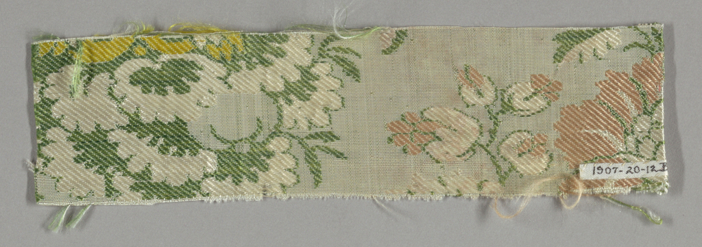 This is a Fragment. It is dated 1700–1750 and we acquired it in 1907. Its medium is silk and its technique is plain compound cloth brocaded with silks. It is a part of the Textiles department.