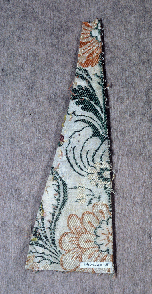 This is a Fragment. It is dated early 18th century and we acquired it in 1907. Its medium is silk and its technique is plain weave with supplementary weft patterning (brocade). It is a part of the Textiles department.