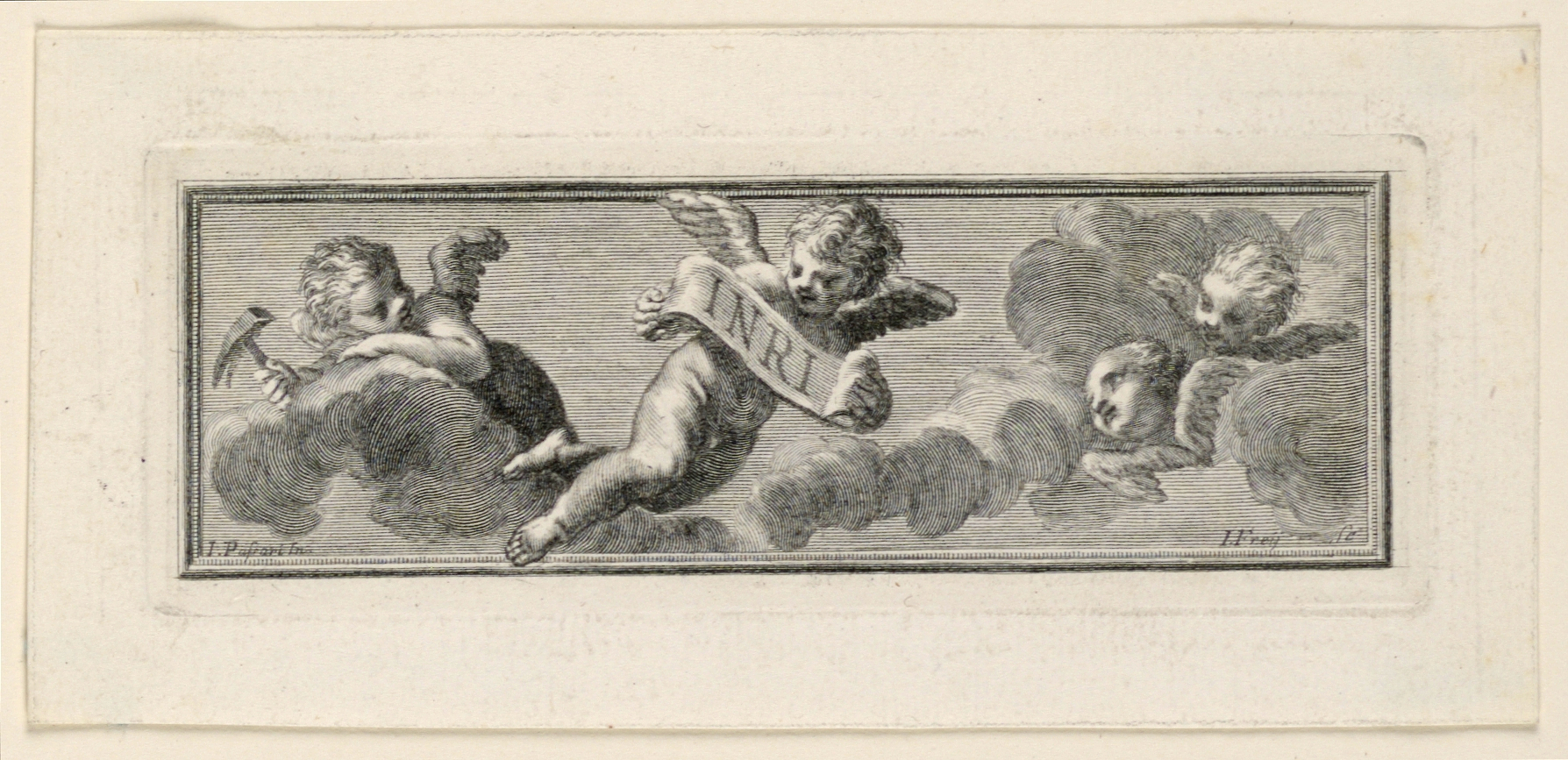 Print, Vignette with Angels and Instruments of the Passion; Print Maker: Jakob Frey; After Giovanni Passari (Italian); Switzerland; engraving on paper; 6.7 × 14.5 cm (2 5/8 × 5 11/16 in.); 1907-7-5-b