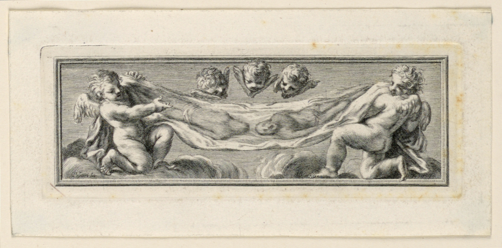 Print, Vignette with Angels and Instruments of the Passion; Print Maker: Jakob Frey; After Giovanni Passari (Italian); Switzerland; engraving on paper; 6.7 × 14.3 cm (2 5/8 × 5 5/8 in.); 1907-7-6-b