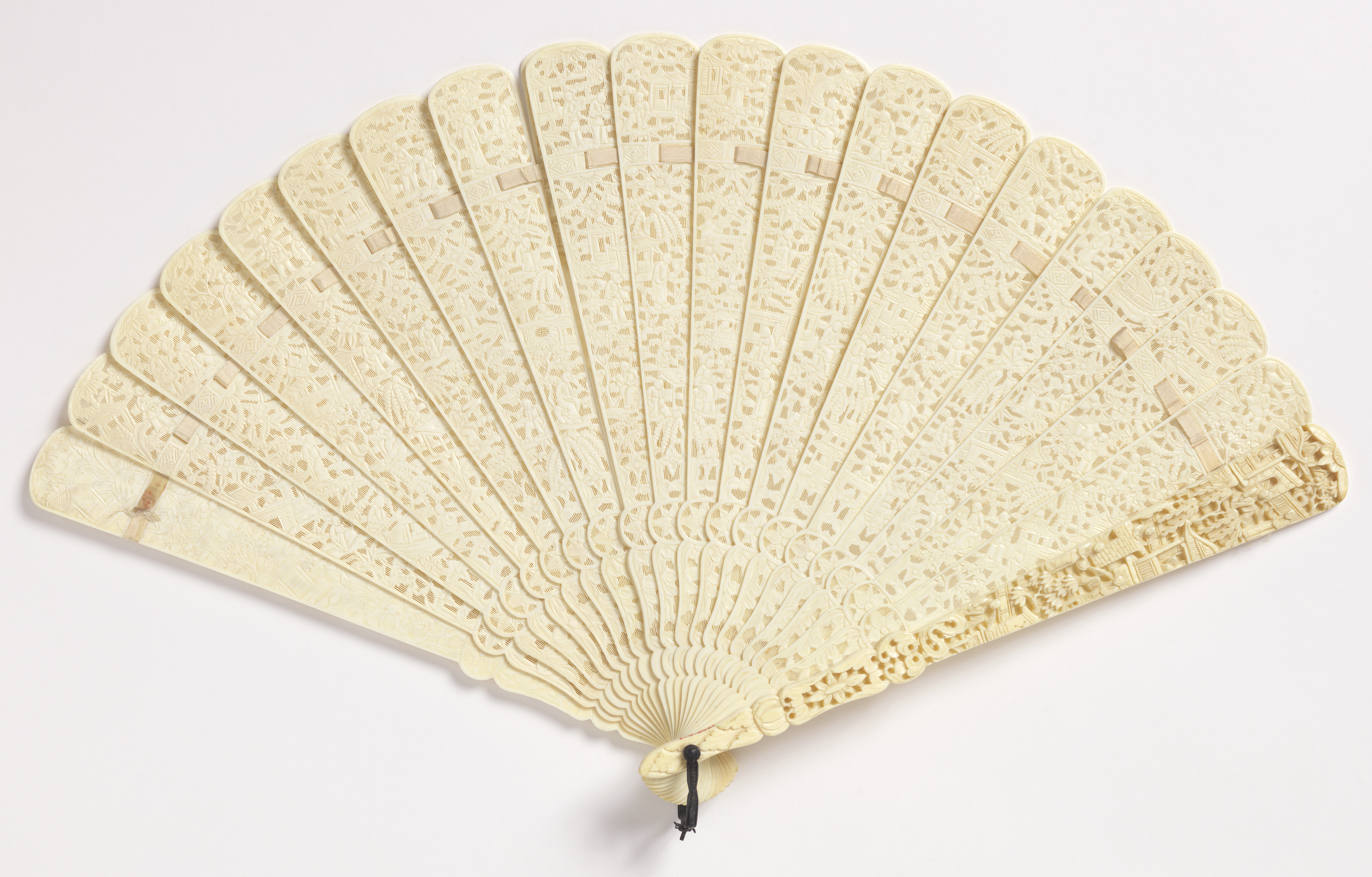 This is a Brisé fan. It is dated 19th century and we acquired it in 1908. Its medium is carved and pierced ivory sticks. It is a part of the Textiles department.